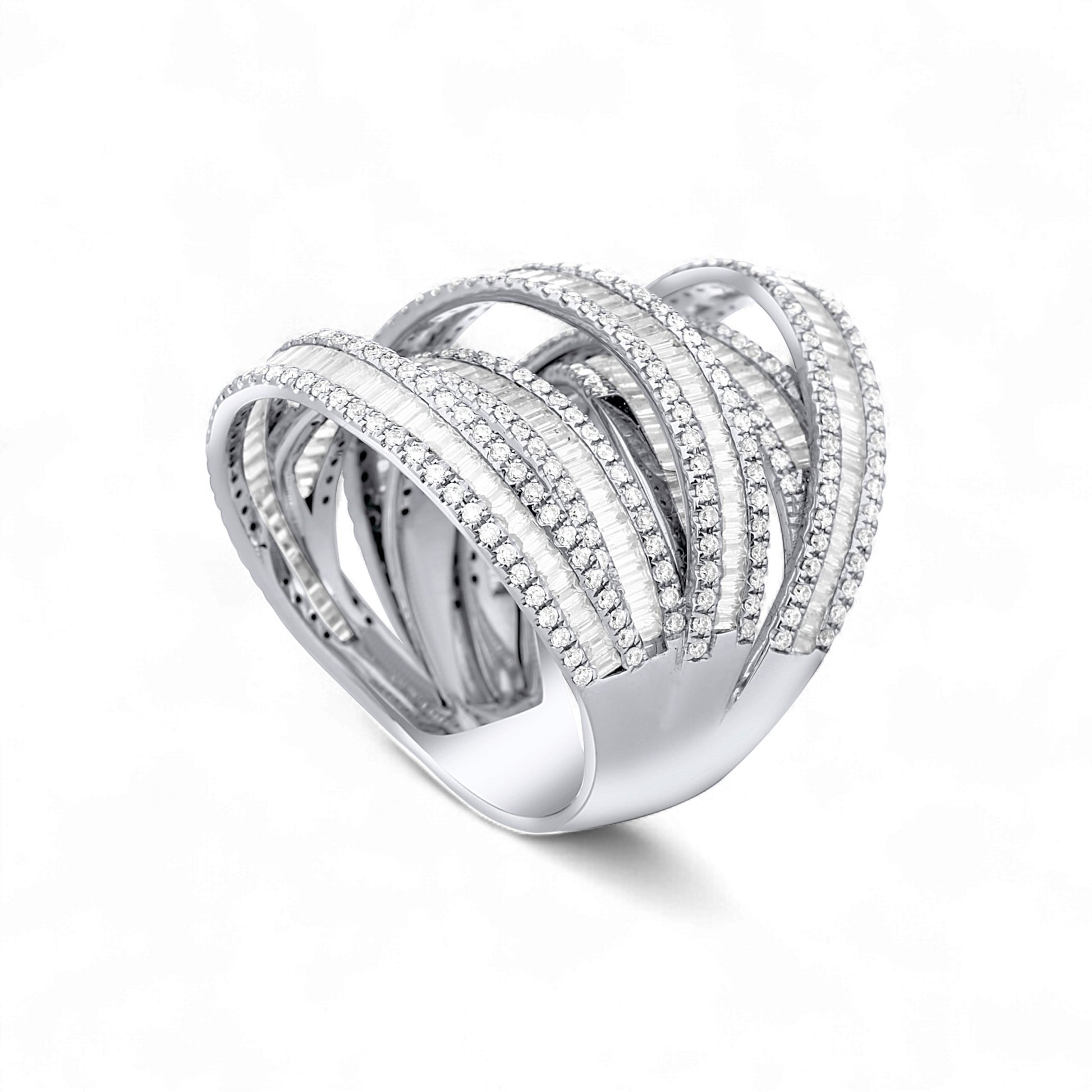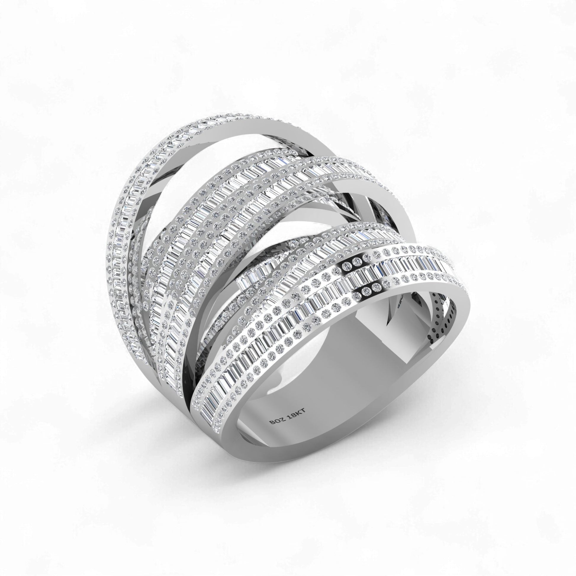 The Layered Crisscross Baguette Cut Tri-Tone Moissanite Ring is a true statement of artistry and elegance. Expertly crafted in luxurious tri-tone 18KT gold, this bold design features intersecting layers of brilliant round and baguette-cut moissanite stones, each meticulously set to create a captivating play of light. The unique crisscross pattern symbolizes unity and connection, making it a perfect choice for celebrating love, milestones, or unforgettable moments.
