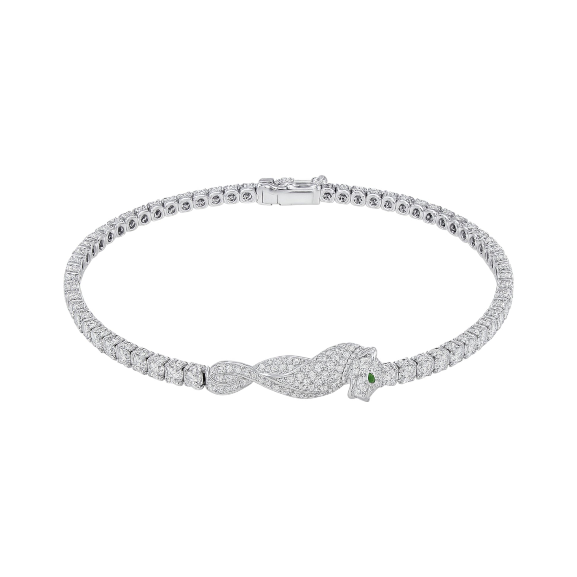 Fierce elegance meets refined craftsmanship in our Full Panther Diamond Bracelet, meticulously crafted in luminous 18KT gold. The bold panther motif is fully encrusted with dazzling pavé-set diamonds, its eyes brought to life with vivid green accents for a striking finish. A seamless line of round-cut diamonds continues along the bracelet, creating a fluid, luxurious silhouette that hugs the wrist with graceful intensity. Finished with a secure hidden clasp, this piece embodies power, sophistication, and timeless allure.
