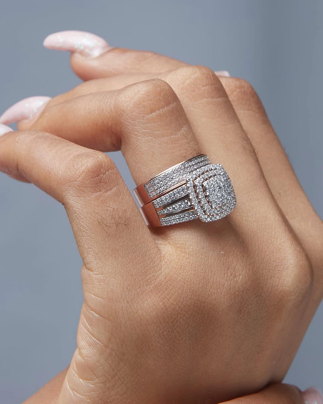 The Omoni Cushion Cut Cluster Natural Diamond Bride Set is a magnificent expression of brilliance and eternal devotion, featuring a cushion-shaped cluster of natural diamonds framed by multiple shimmering halos that magnify its sparkle. Handcrafted in luxurious 18KT gold, the engagement ring’s bold split-shank design glitters with pavé-set diamonds, seamlessly paired with a matching diamond-studded wedding band for a breathtaking finish. The cushion cut, admired for its blend of timeless romance and modern elegance, symbolizes a love that grows brighter and stronger with every moment, making this bridal set the perfect choice for the bride who desires grandeur, sophistication, and a forever promise.