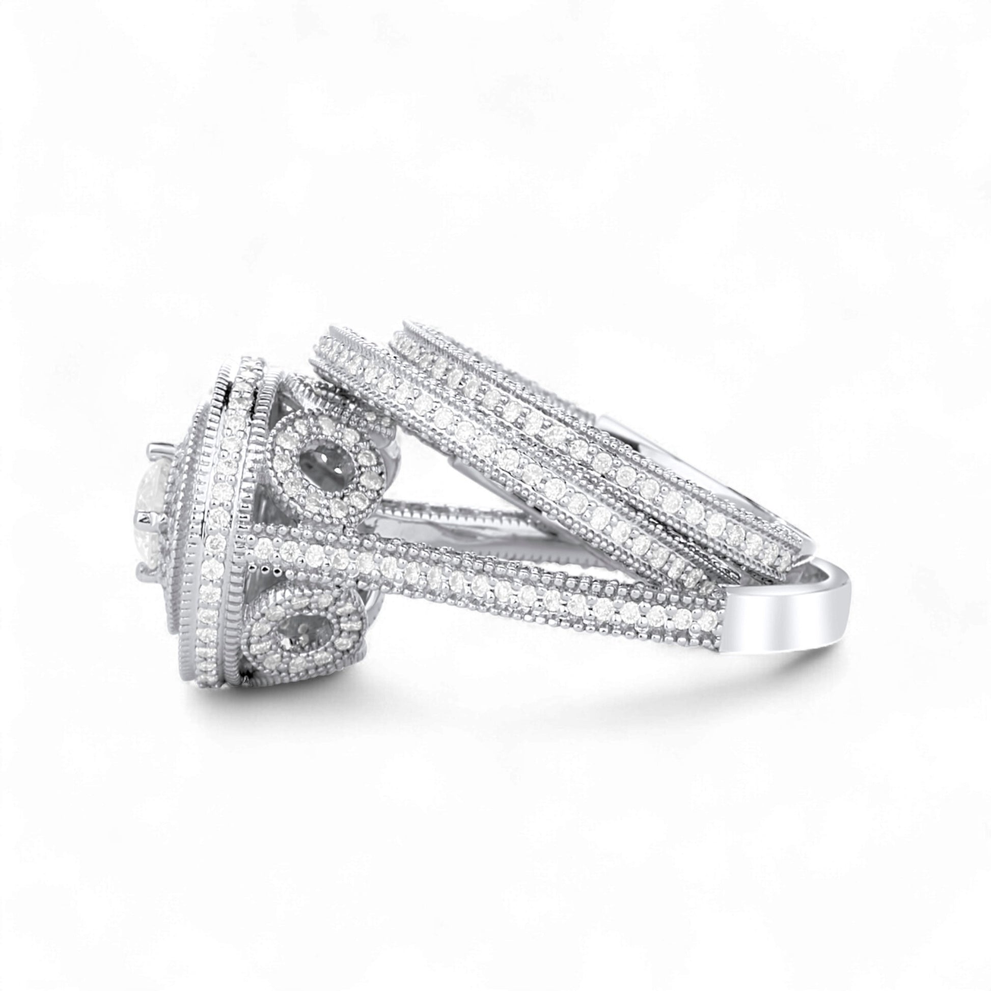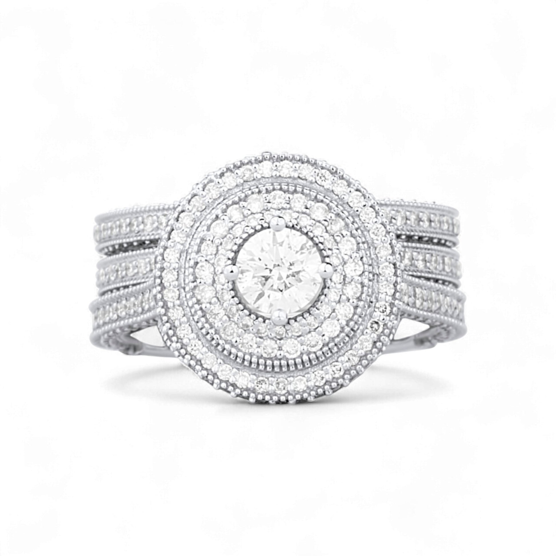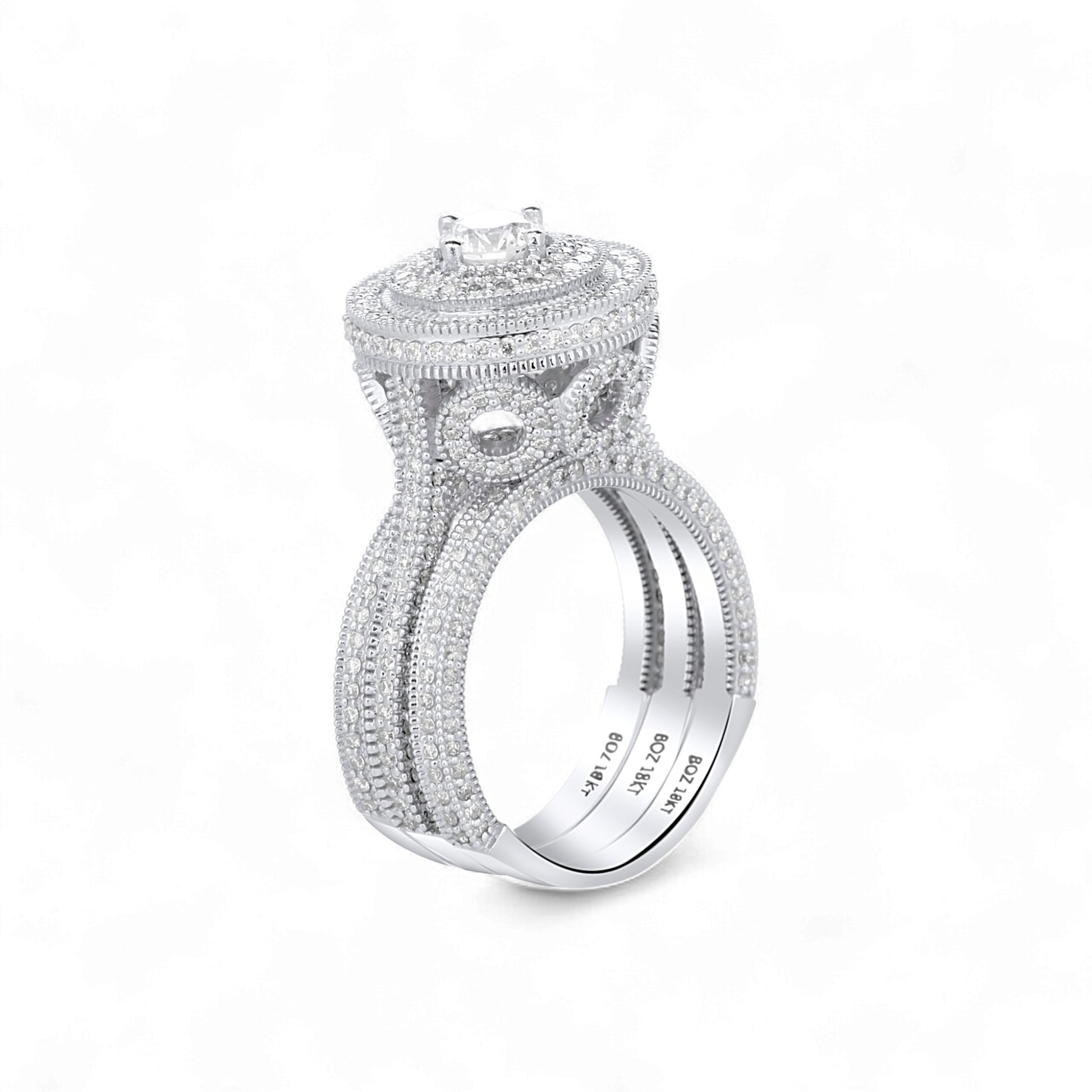 The Zack Round Cut Natural Diamond Bride Set is a dazzling celebration of everlasting love, featuring a brilliant round-cut natural diamond at its center surrounded by multiple diamond halos that magnify its radiance and fire. Handcrafted in luminous 18KT gold, the engagement ring is adorned with pavé-set diamonds along its split shank, while the matching wedding band completes the set with perfect harmony.