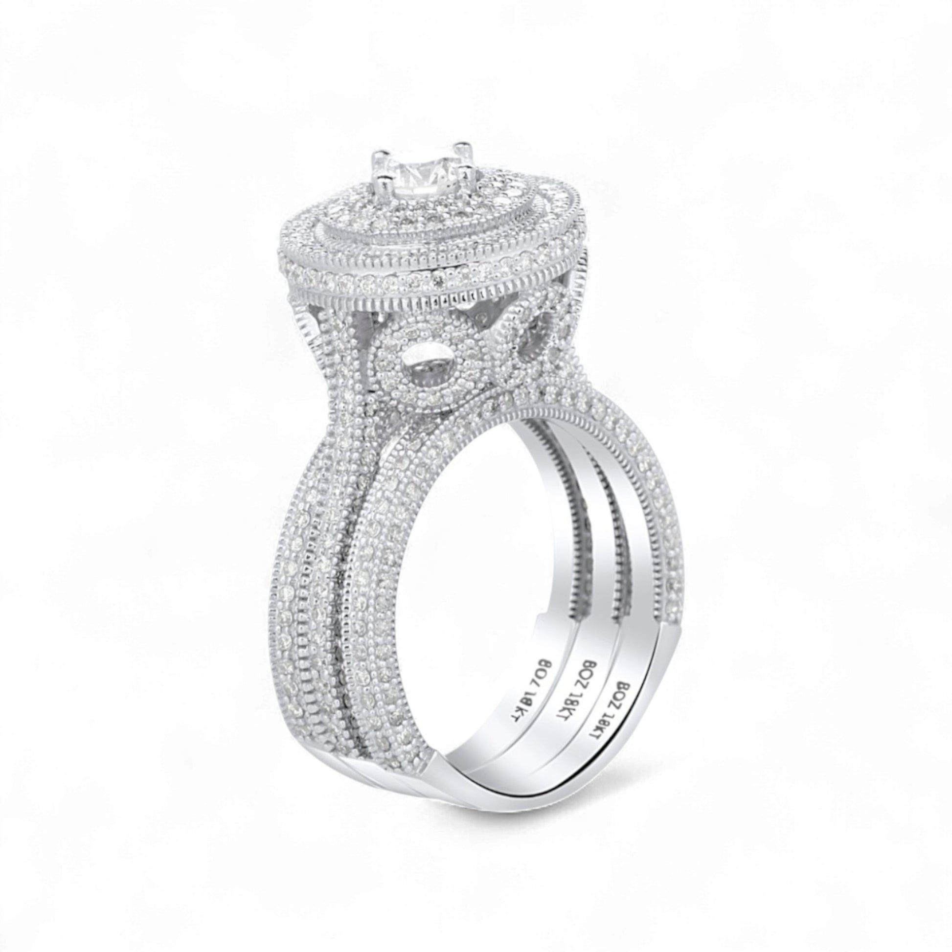 The Zack Triple Halo Round Cut 3-piece Natural Diamond Bride Set is a breathtaking symbol of grandeur and devotion, featuring a brilliant round-cut center diamond encircled by three dazzling halos that amplify its fire and brilliance. Handcrafted in luxurious 18KT gold, this 3-piece set includes an intricately detailed engagement ring with pavé-set natural diamonds flowing down the band, complemented by two perfectly matched diamond wedding bands. The triple halo design represents layers of love, growth, and eternity, making this set a true statement of passion and everlasting unity for the bride who desires timeless elegance with bold sparkle.