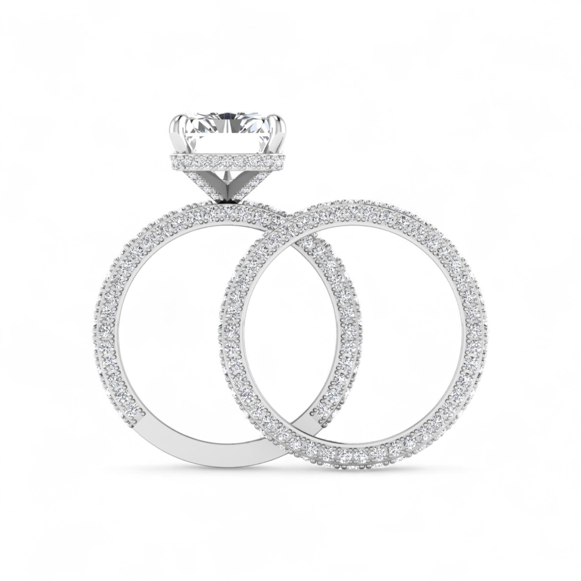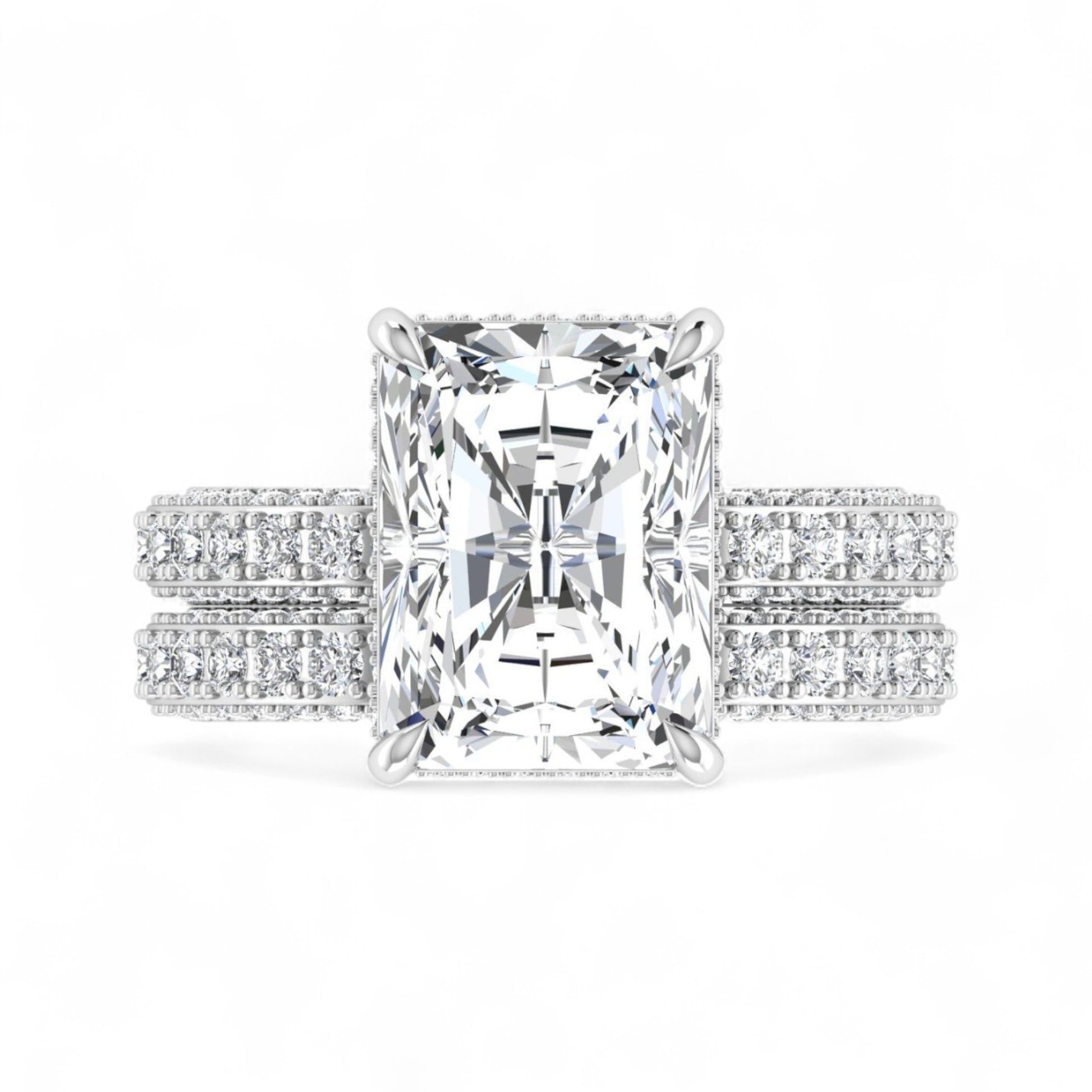 Bold and breathtaking, the Amina Radiant Cut Lab Grown Diamonds Bride Set is a masterpiece of brilliance and sophistication. Handcrafted in enduring platinum, the engagement ring showcases a striking radiant-cut lab grown diamond at its center, celebrated for its fire, symmetry, and clarity. The band and matching wedding ring are lined with rows of pavé-set lab grown diamonds, creating a seamless flow of sparkle that embodies elegance from every angle.