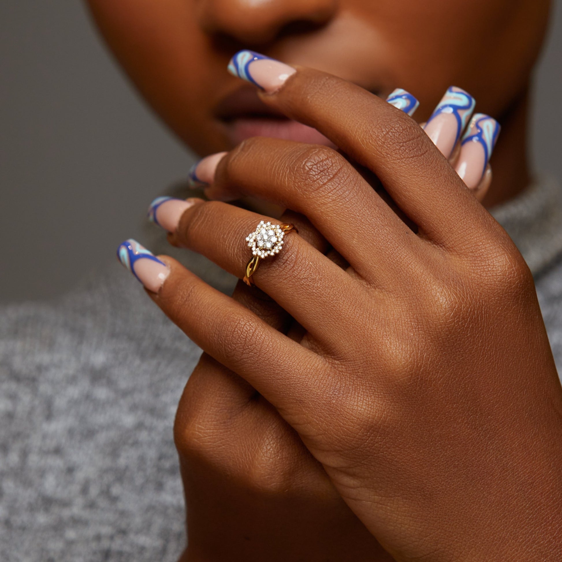 The BOZ Forever Natural Diamond Engagement Ring is a masterpiece of elegance and brilliance. Featuring a radiant floral-inspired cluster of natural diamonds set in lustrous 18K gold, this ring sparkles from every angle while its twisted band adds a touch of modern sophistication.