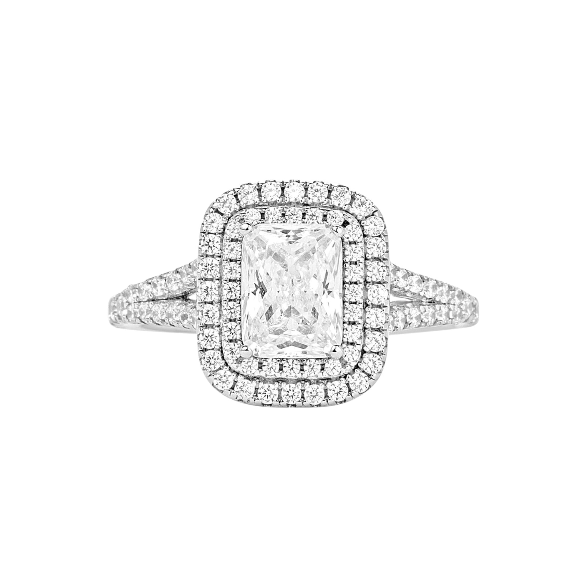 The Kylie Radiant Cut Moissanite and Natural Diamonds Engagement Ring is a striking blend of brilliance and craftsmanship. Featuring a radiant-cut moissanite center stone encircled by a double halo of natural diamonds and a pavé-set split band, this ring is designed to dazzle with timeless sophistication and enduring sparkle.