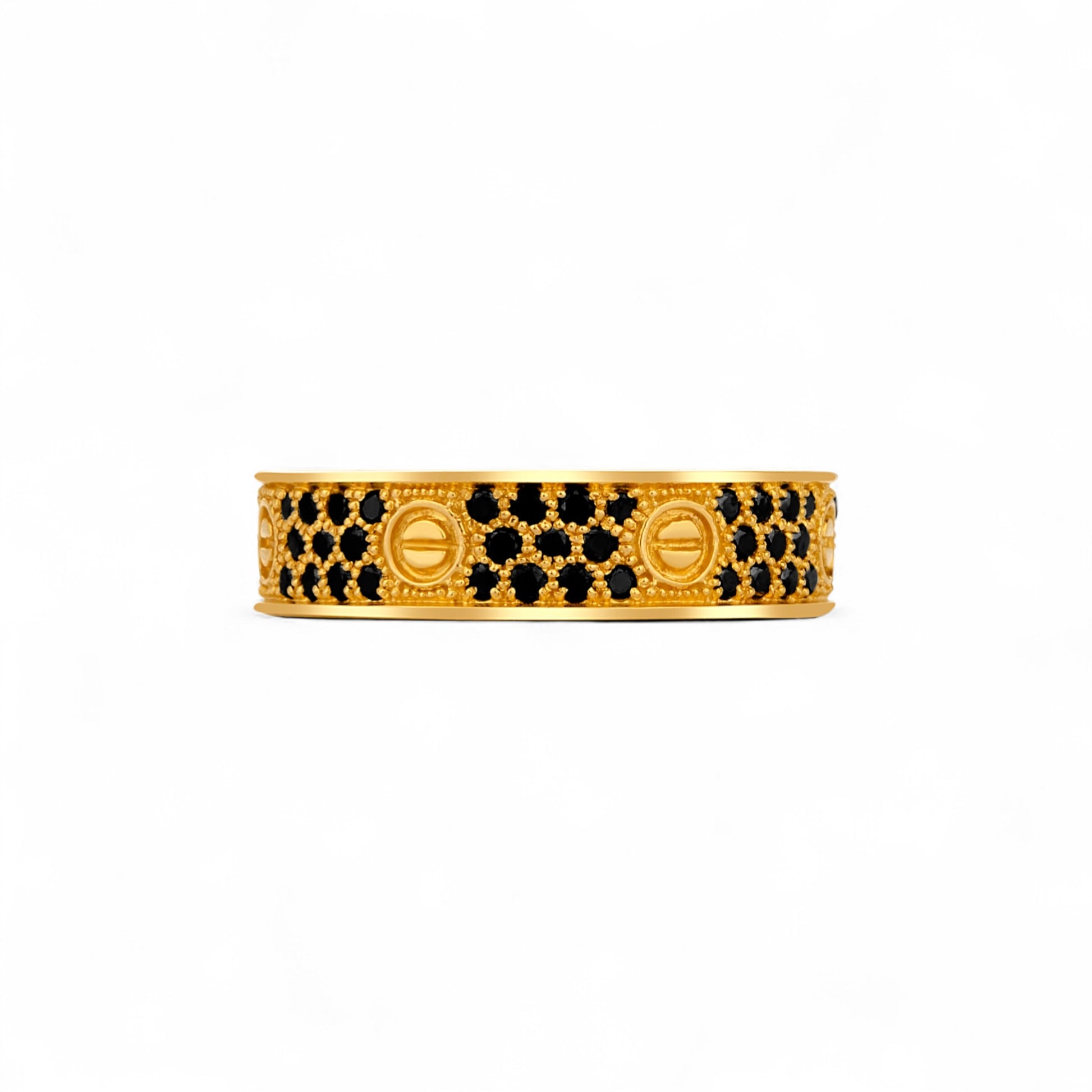 The rich contrast between the deep, enigmatic stones and the warm glow of gold makes this band a powerful symbol of strength, passion, and individuality. Whether worn as a wedding ring or a personal style statement, it speaks to a love that’s anything but ordinary.
