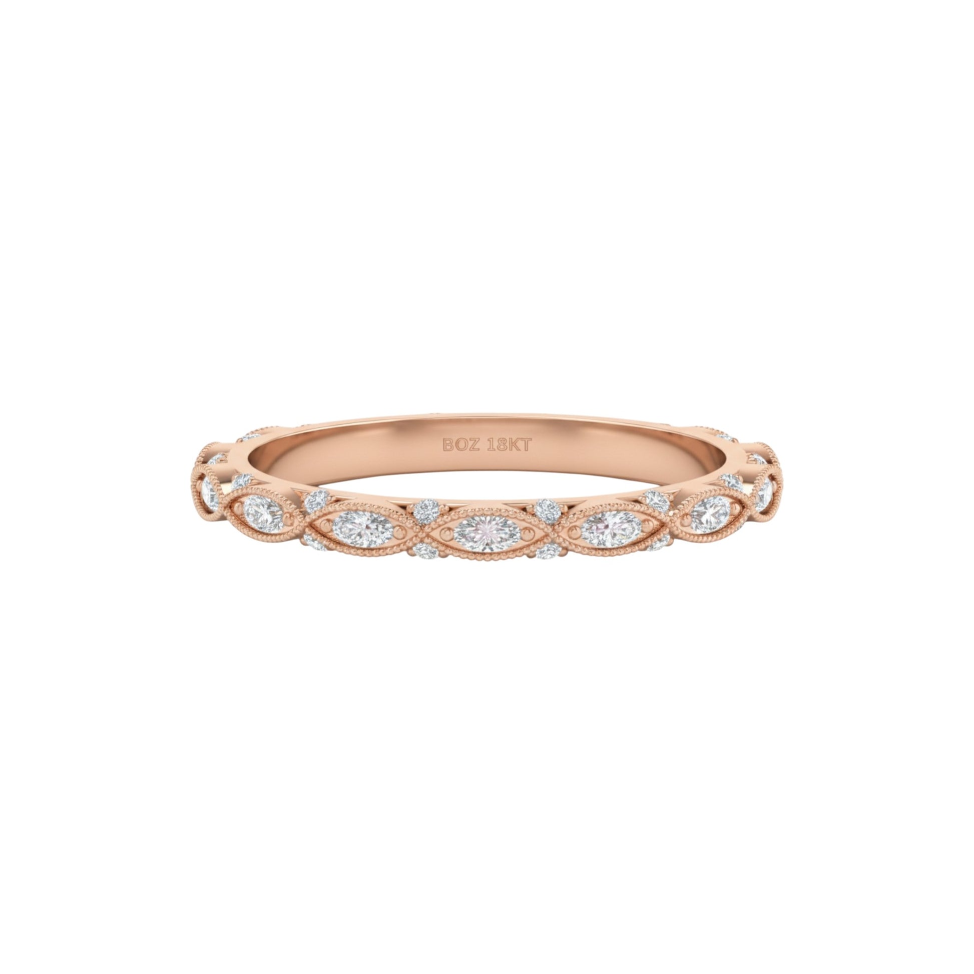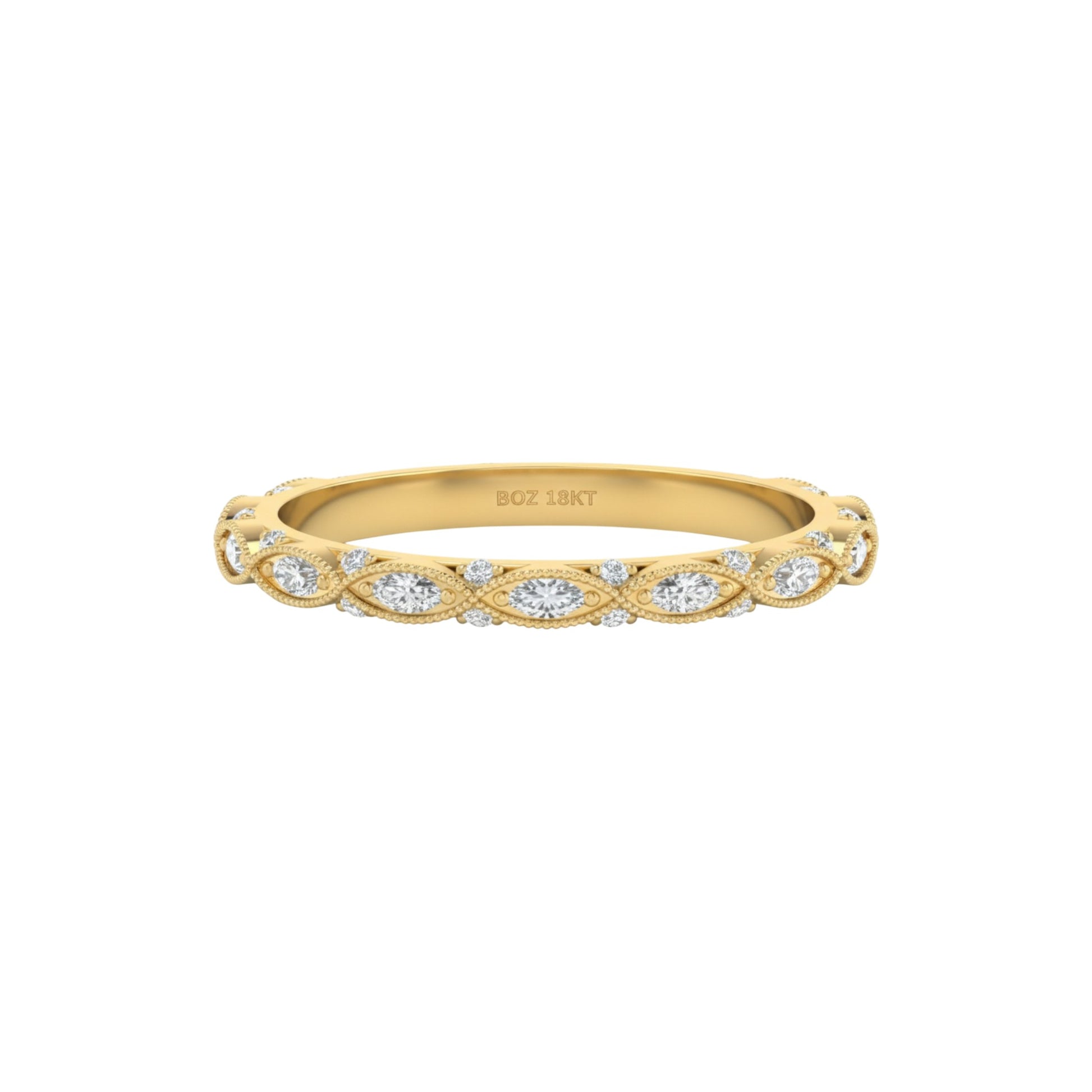 Delicate and refined, the Hazel Moissanite Band is a timeless expression of elegance. Handcrafted in luminous 18K gold, this band features a graceful sequence of marquise-shaped designs, each adorned with sparkling moissanite stones that shimmer with every movement. Its intricate detailing and slender profile make it the perfect complement to an engagement ring or a radiant stand-alone piece.
