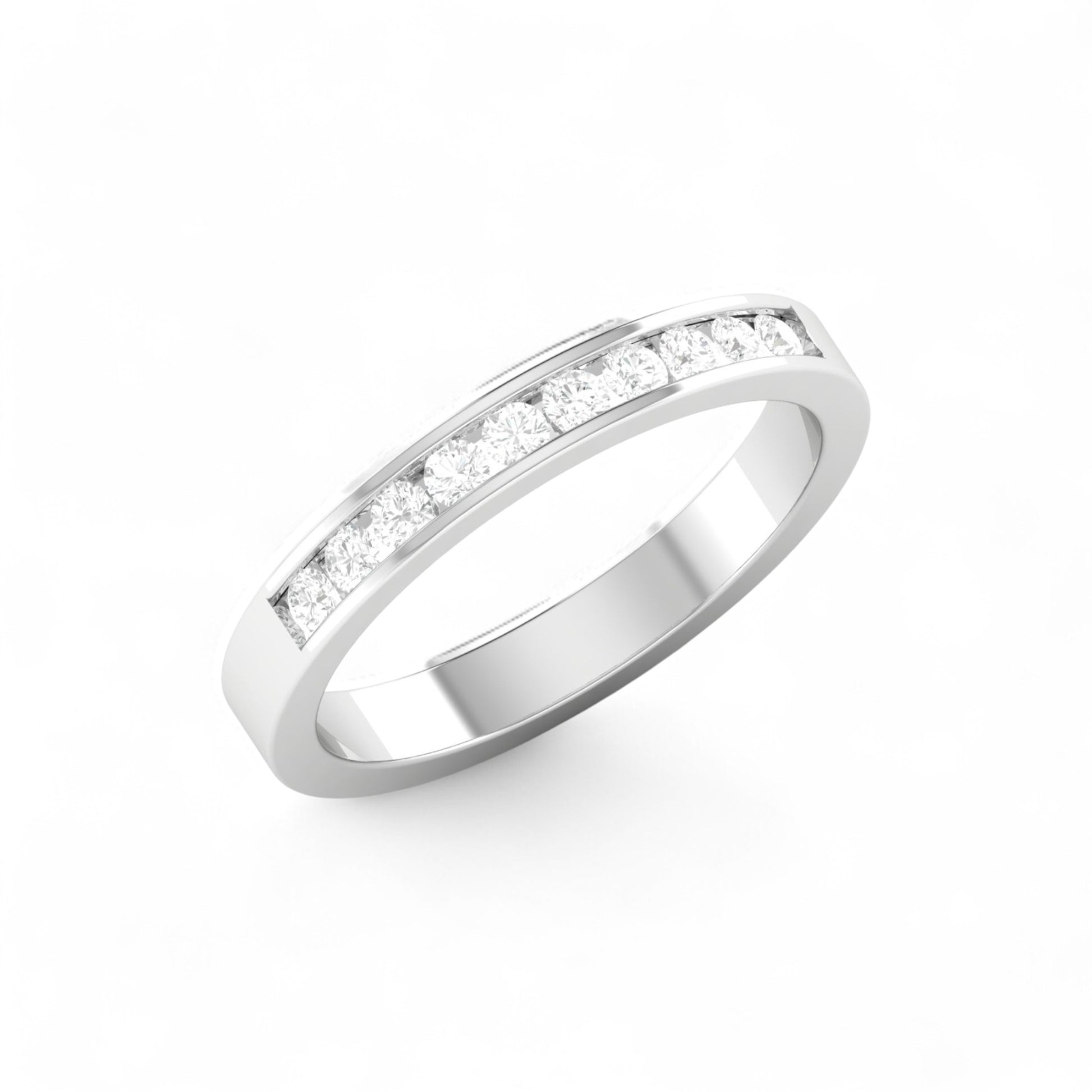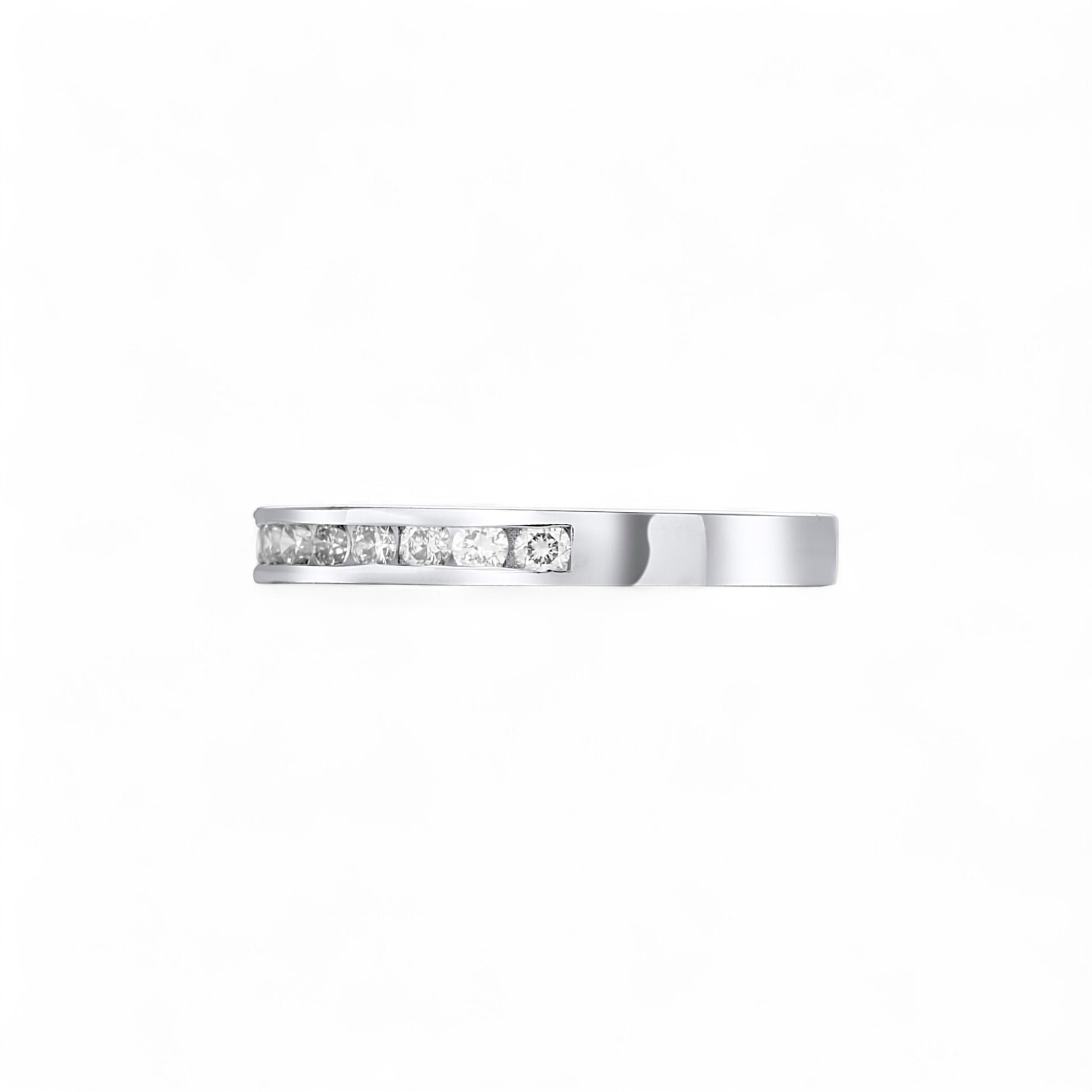 Crafted in luminous 18 Karat gold, the Channel Diamond Band features a sleek row of round brilliant diamonds, precision-set in a secure channel for a smooth, modern finish. Its timeless design makes it the perfect choice for a wedding band, anniversary gift, or elegant stacking piece.