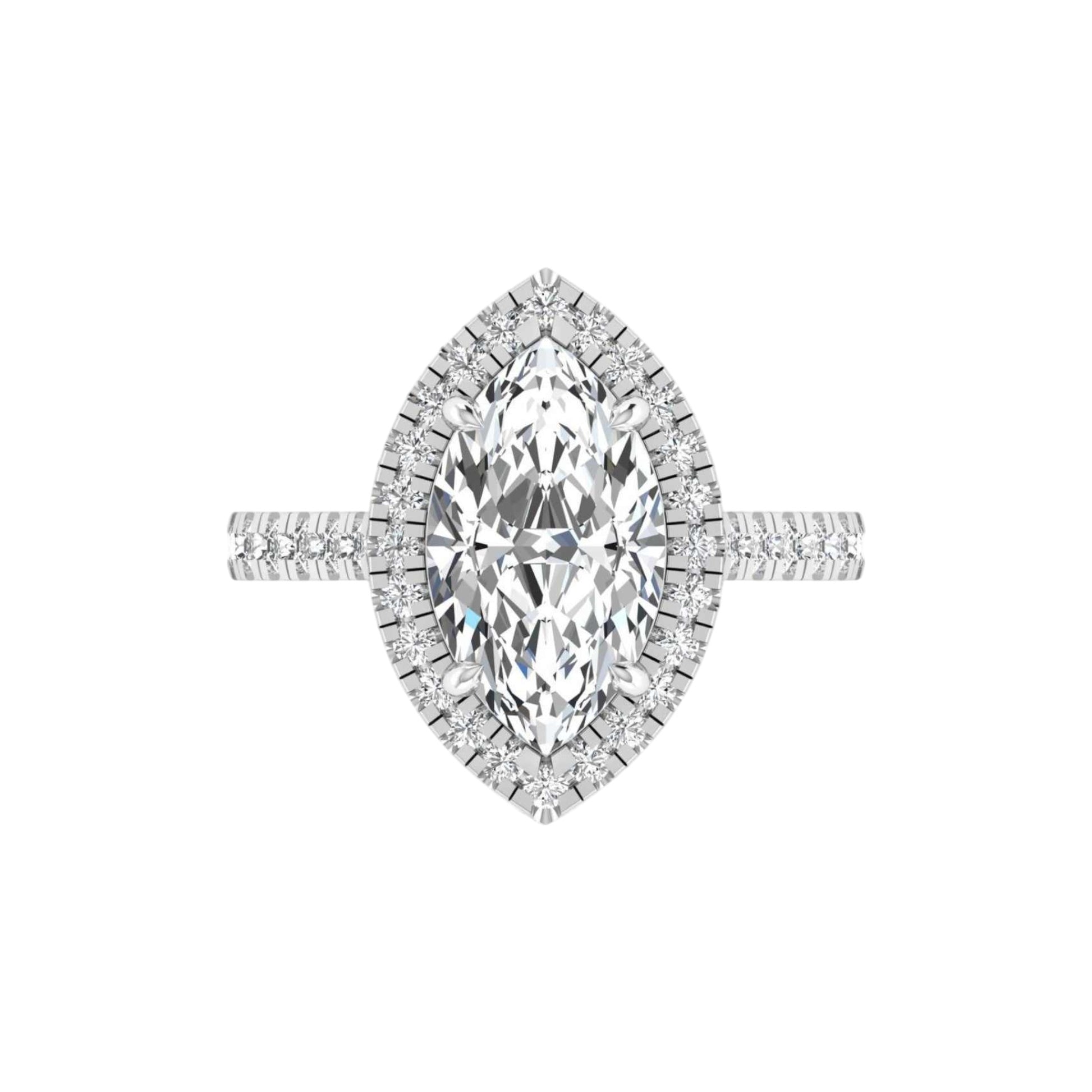 The Jackie ring is a bold yet graceful statement of timeless love, crafted with a striking marquise-cut moissanite at its heart. Set in luminous sterling silver, the elongated silhouette sparkles with fire and brilliance, enhanced by a delicate halo and a pavé band that add layers of radiance. This design captures both sophistication and strength, making it a perfect choice for those who appreciate elegance with an edge.