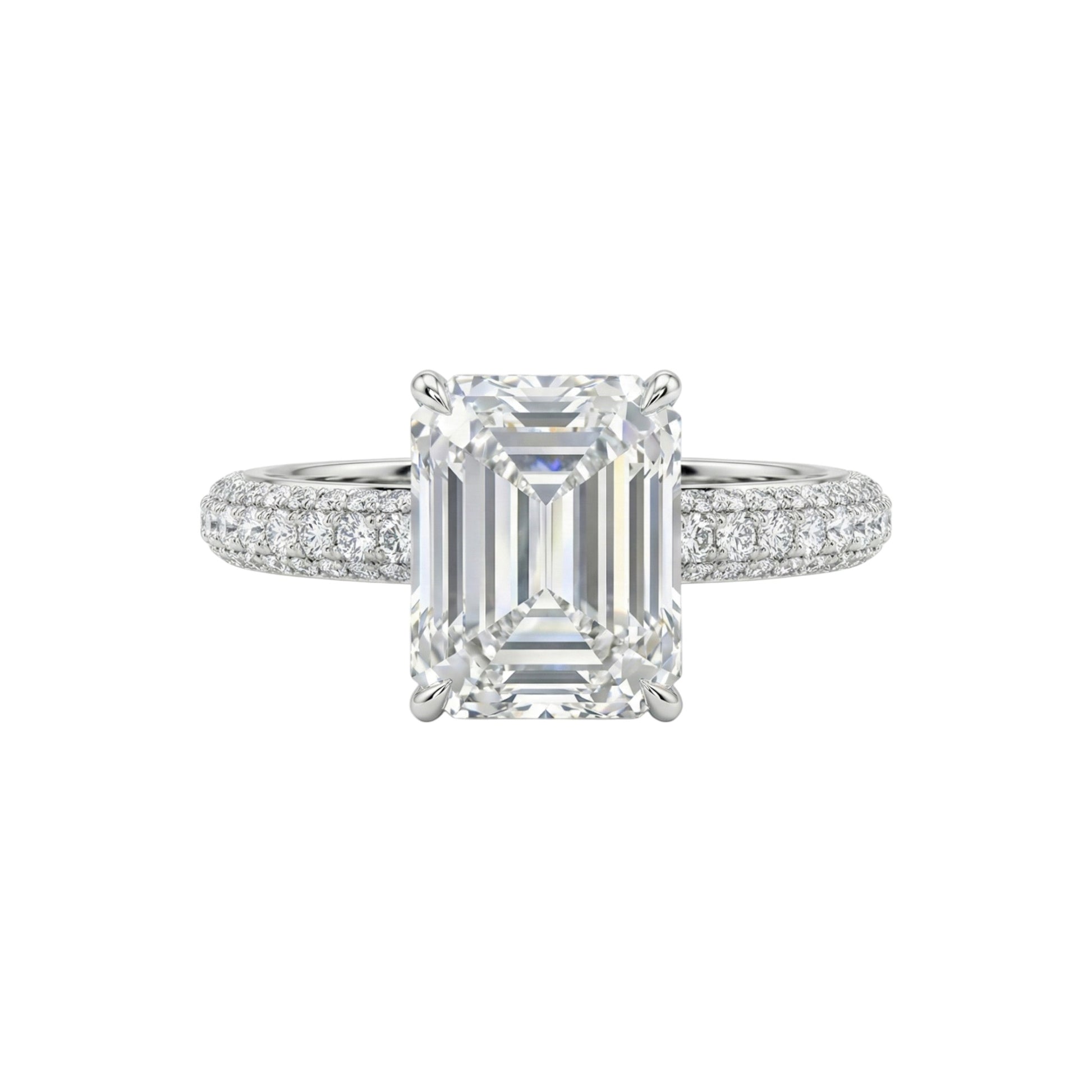 This ring represents clarity, intention, and enduring love. The emerald cut reflects honesty and strength, while the diamond-accented band symbolizes the moments that support and surround a lifelong commitment