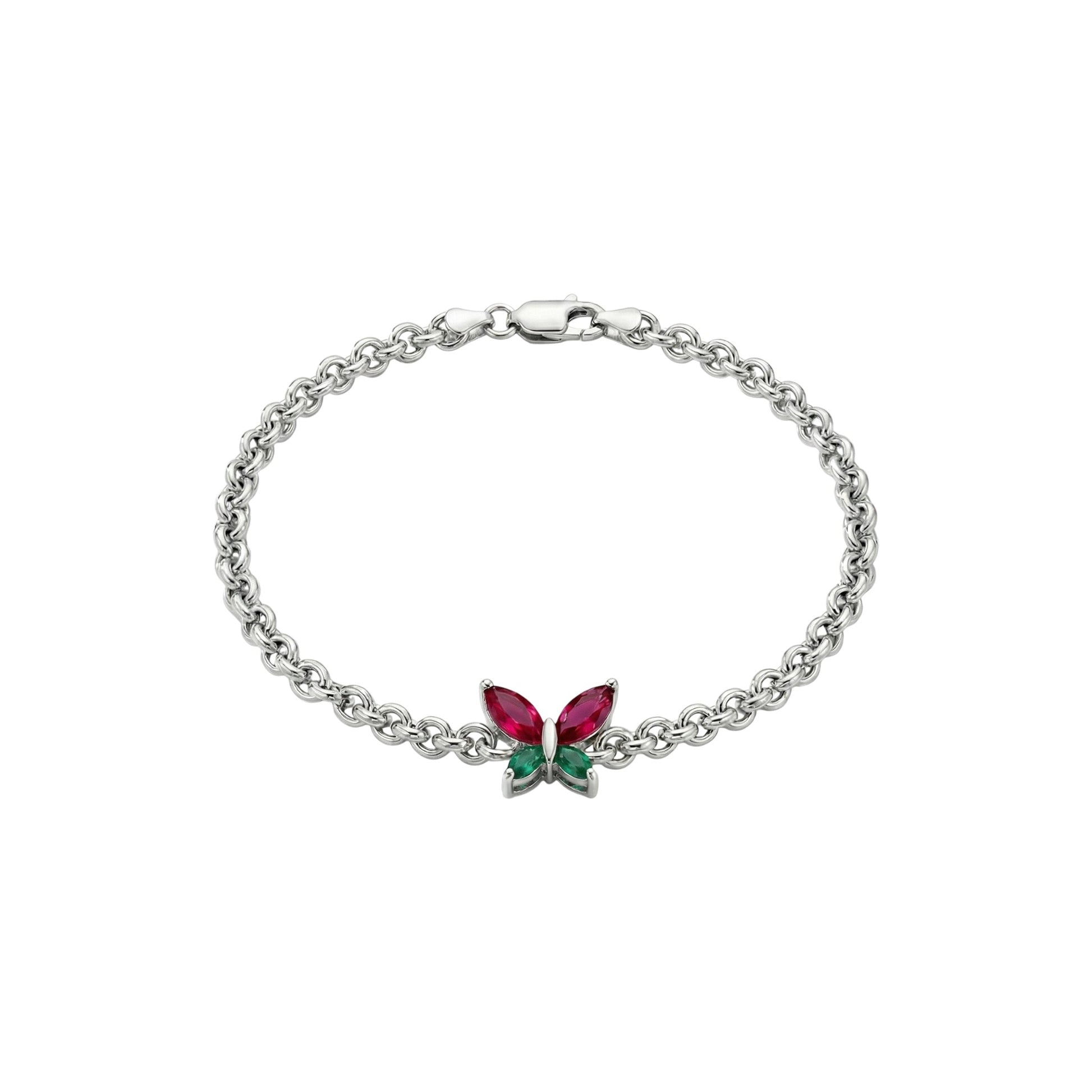 The Emerald and Pink Butterfly Heart Bracelet features a delicate butterfly motif accented with vibrant emerald stones, set along a refined silver chain that sits beautifully on the wrist. Its polished finish and lightweight design create a graceful balance of color and shine, making it an effortless piece for everyday wear or subtle layering with other favorites.